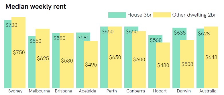 Over the three months to March, the median weekly rent for two-bedroom other dwellings rose in all capital cities except Sydney, where it remained stable. The median weekly rent for three-bedroom houses increased in Brisbane, Darwin, Hobart and Adelaide, and remained stable in Sydney, Melbourne and Canberra.